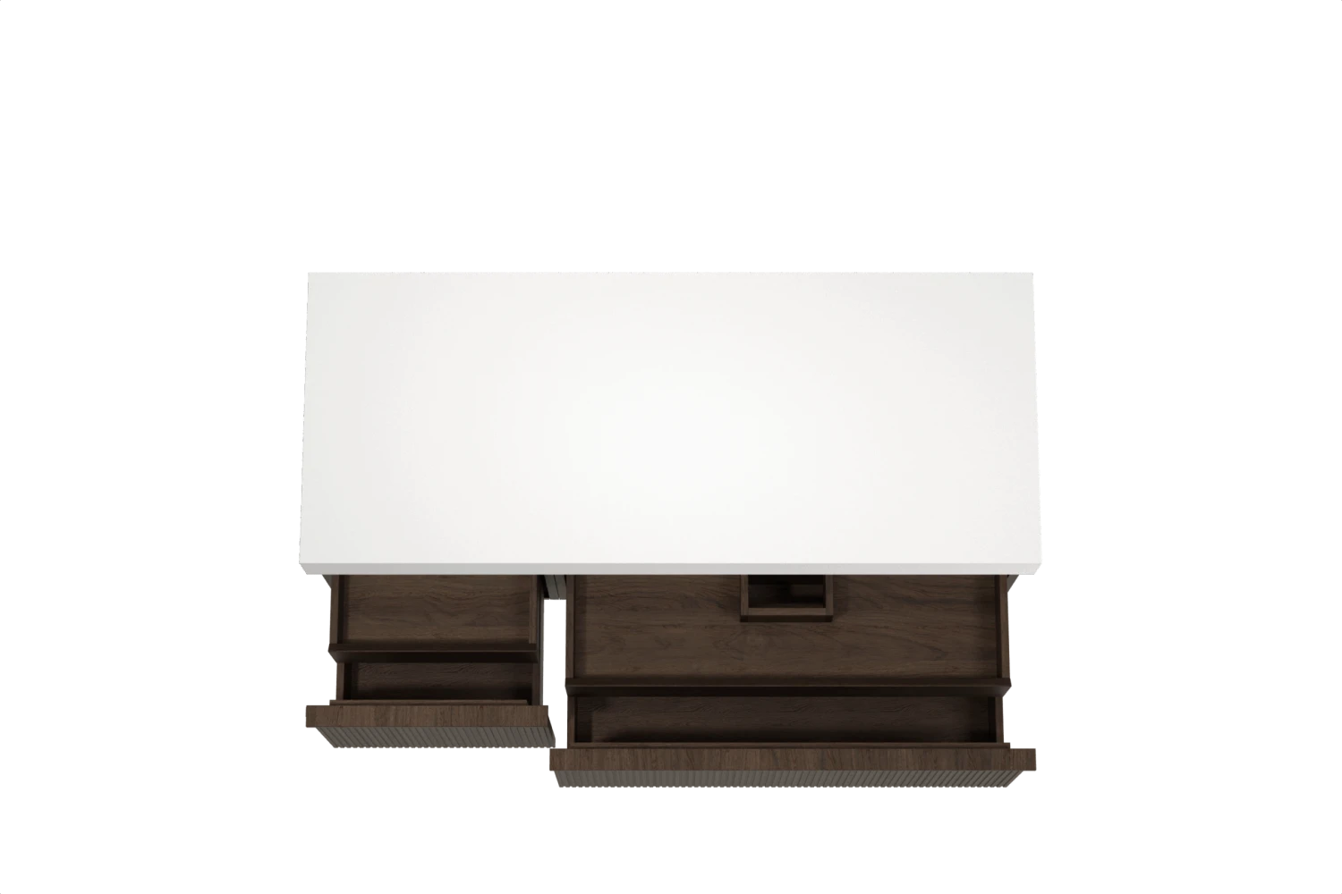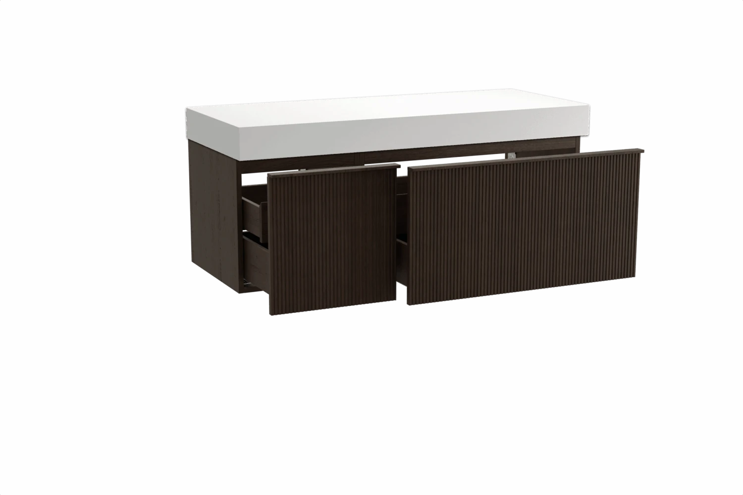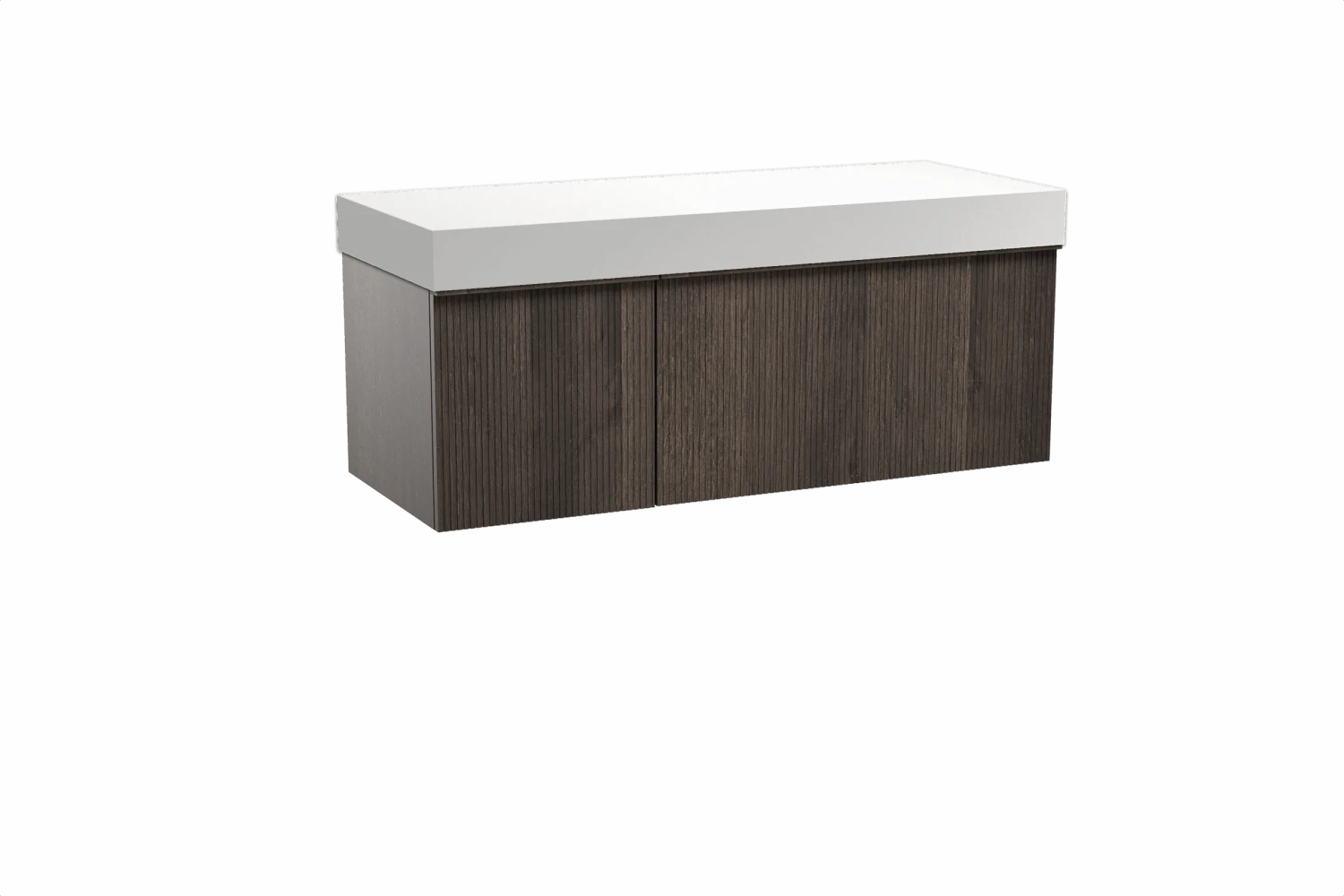 Balmani Forma Zwevend Badkamermeubel 135 X 55 Cm Gerookte Eik Met Dominus Enkel Of Dubbel Tablet In Solid Surface Mat Wit Verticale Symmetrische Rechte Ribbel